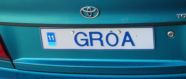 In Reykjavík, there are plenty of signs of belief in the power of writing. Despite its location on the route between several big English-speaking countries, it has managed to resist much of the pressure to advertise in English and have signs in English. For print-addicts, the city language-scape is a treasure-house – vocabulary is reinforced by seeing words in other languages in signs and notices both public (roads, schools, monuments) and private (shop and business names and windows, advertisements, churches, graveyards). And hey! vanity plates using Icelandic diacritics [Gróa was a witch healer in Norse mythology].